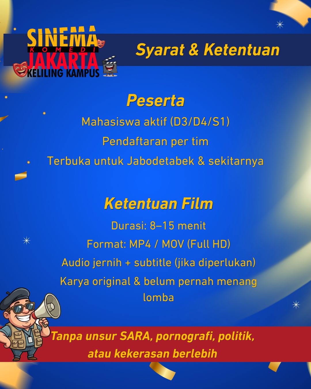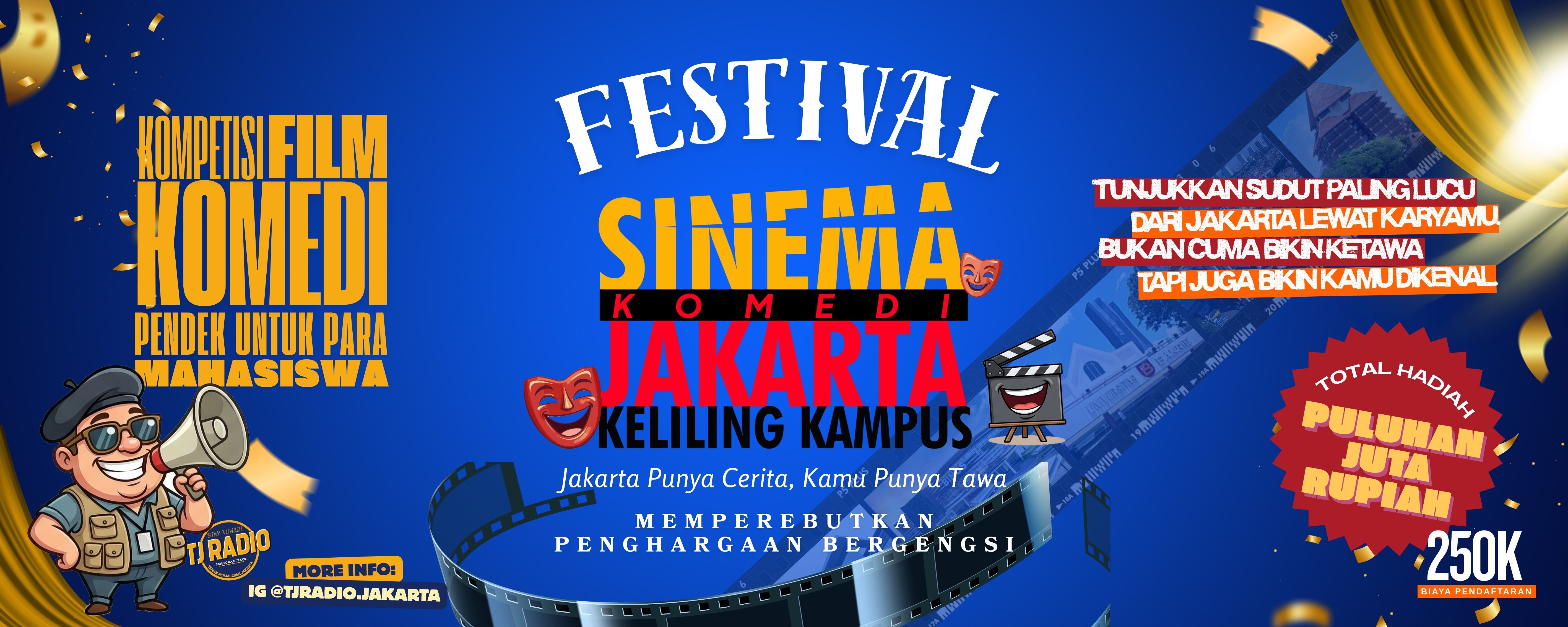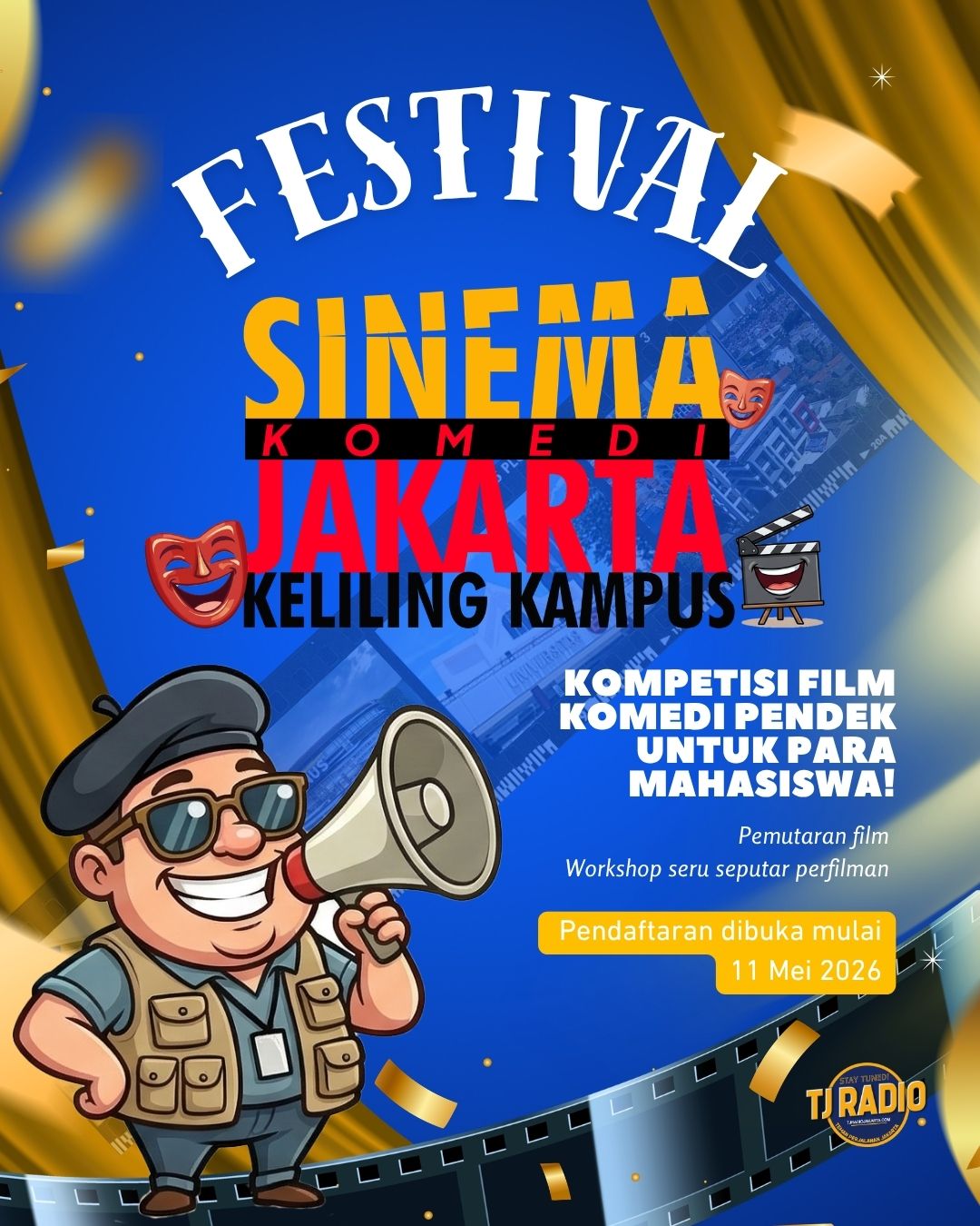 Kompetisi Film Komedi Pendek untuk Para Mahasiswa! Pemutaran film Workshop seru seputar perfilman, Pendaftaran dibuka mulai 11 Mei 2026. More Info : IG @sinemakomedijakarta